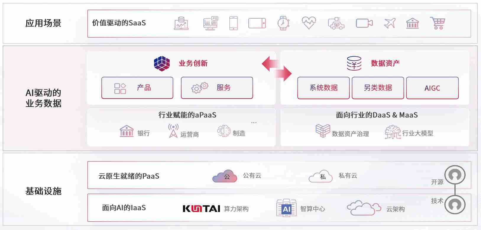 数字时代,,,,围绕企业数字化转型的关键要素,,z6尊龙数码开创性的提出数云融合战略和技术体系框架,,,,着力在云原生、、、、数字原生、、、、AI原生和信创产业上架构产品和服务能力,,,,为处在不同数字化转型阶段的快消零售、、、、汽车、、、金融、、医疗、、政企、、、、教育、、、运营商等行业客户提供泛在的敏捷IT能力和融合的数据驱动能力,,,,构建跨界融合创新的数字业务场景和新业务模式,,助力企业级客户建立面向未来的核心能力和竞争优势,,,,全面推动社会的数字化、、、、智能化转型升级。。。